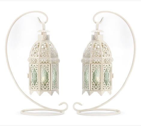 The glow of a tealight through the pale green glass panes and the charming lattice-designed cutouts of the shell add a romantic aura to any setting. Hang the lantern on the accompanying stand for heightened effect! Tealights only (not included). Metal and glass. Set of 2. SIZE: Lantern: 4" x 4" x 8 1/4" high. Stand: 5 1/2" diameter x 13 high. Readmore .. .